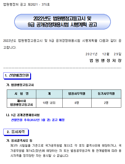 2022 ¹ý¿øÇàÁ¤Ã³ 9±Þ °ø°³°æÀïä¿ë½ÃÇè ½ÃÇà°èȹ °ø°í