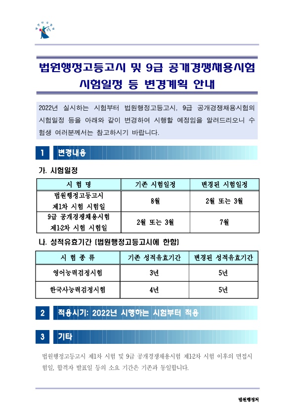 2022 ¹ý¿øÇàÁ¤Ã³ ½ÃÇà ¹ý¿øÇàÁ¤°íµî°í½Ã ¹× 9±Þ °ø°³°æÀïä¿ë½ÃÇè ½ÃÇèÀÏÁ¤ µî º¯°æ°èȹ ¾È³»