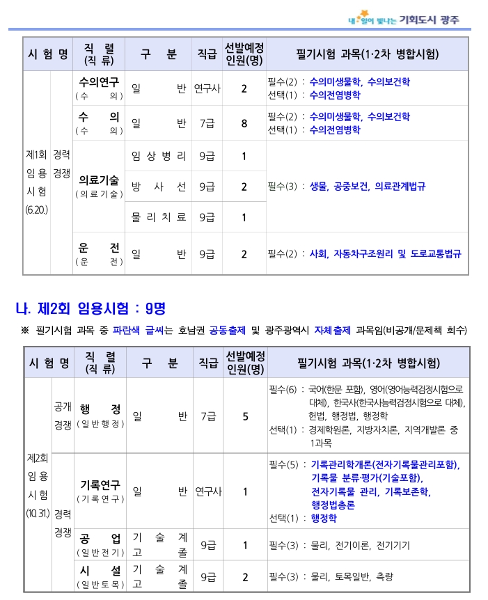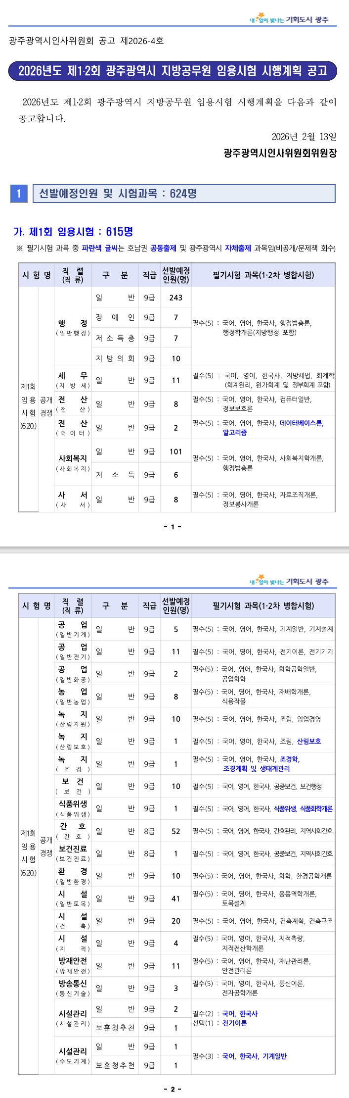 2026³âµµ Á¦1¡¤2ȸ ±¤ÁÖ±¤¿ª½Ã Áö¹æ°ø¹«¿ø ÀÓ¿ë½ÃÇè ½ÃÇà°èȹÀ» ´ÙÀ½°ú °°ÀÌ °ø°íÇÕ´Ï´Ù.