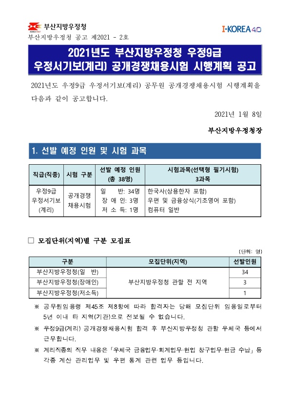 2021 ºÎ»êÁö¹æ¿ìÁ¤Ã» ¿ìÁ¤9±Þ ¿ìÁ¤¼±âº¸(°è¸®) °ø°³°æÀïä¿ë½ÃÇè ½ÃÇà°èȹ °ø°í