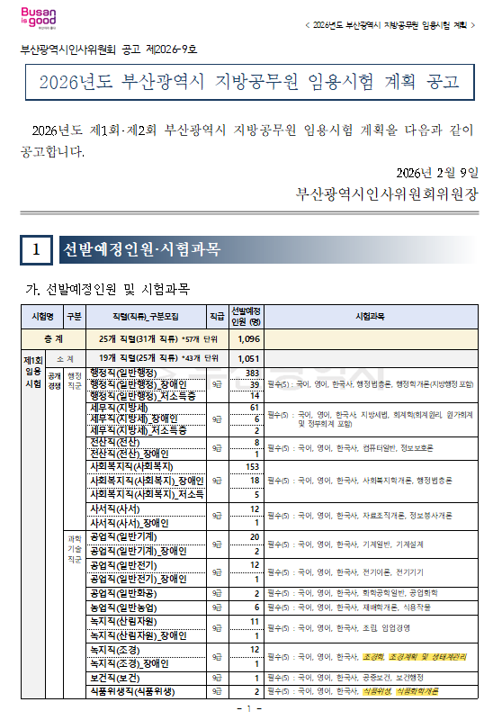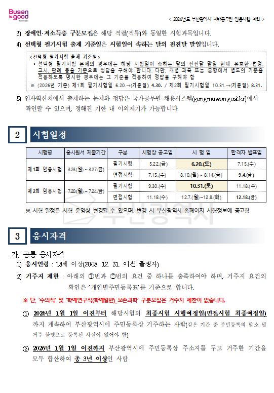 2026³âµµ Á¦1ȸ¡¤Á¦2ȸ ºÎ»ê±¤¿ª½Ã Áö¹æ°ø¹«¿ø ÀÓ¿ë½ÃÇè °èȹÀ» ºÙÀÓ°ú °°ÀÌ °ø°íÇÕ´Ï´Ù.