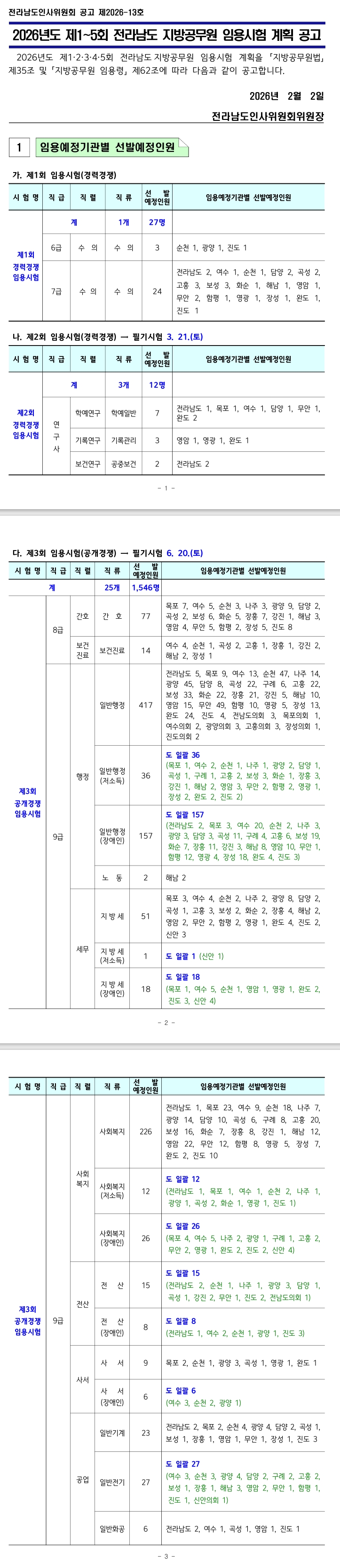 2026³âµµ Á¦1¡¤2¡¤3¡¤4¡¤5ȸ Àü¶ó³²µµÁö¹æ°ø¹«¿ø ÀÓ¿ë½ÃÇè °èȹÀ» ¡¸Áö¹æ°ø¹«¿ø¹ý¡¹ Á¦35Á¶ ¹× ¡¸Áö¹æ°ø¹«¿ø ÀÓ¿ë·É¡¹ Á¦62Á¶¿¡ µû¶ó ºÙÀÓ°ú °°ÀÌ °ø°íÇÕ´Ï´Ù.