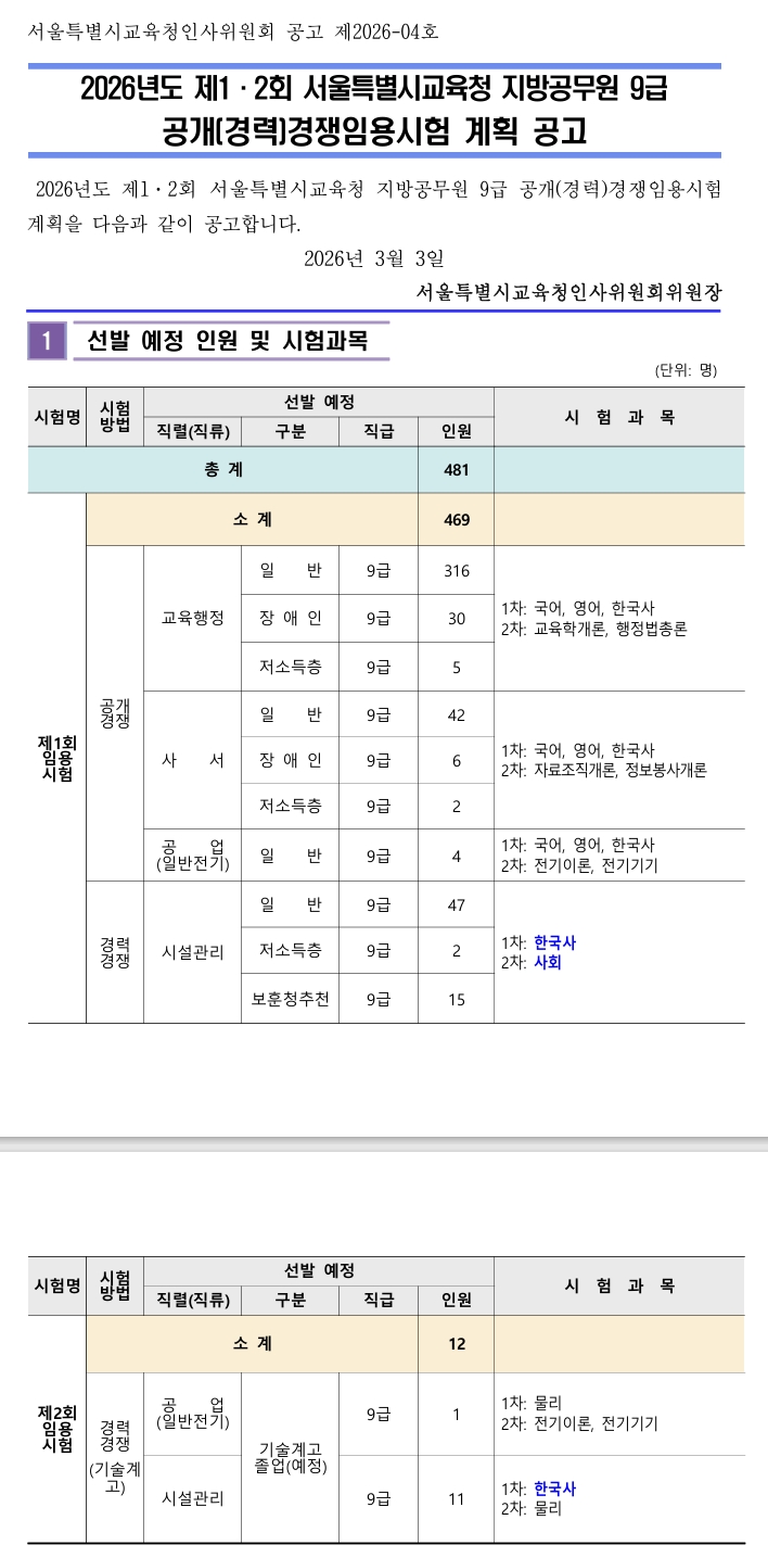 2026³âµµ Á¦1¡¤2ȸ ¼­¿ïƯº°½Ã±³À°Ã» Áö¹æ°ø¹«¿ø 9±Þ °ø°³(°æ·Â)°æÀïÀÓ¿ë½ÃÇè °èȹ °ø°í