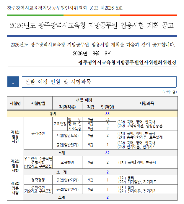 2026³âµµ ±¤ÁÖ±¤¿ª½Ã±³À°Ã» Áö¹æ°ø¹«¿ø ÀÓ¿ë½ÃÇè °èȹÀ» ºÙÀÓ°ú °°ÀÌ °ø°íÇÕ´Ï´Ù.