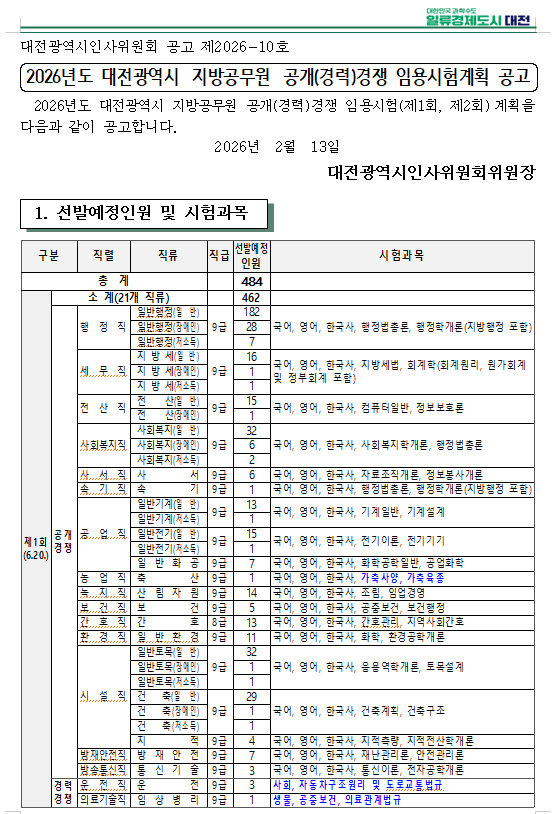 2026³âµµ ´ëÀü±¤¿ª½Ã Áö¹æ°ø¹«¿ø °ø°³(°æ·Â)°æÀï ÀÓ¿ë½ÃÇè(Á¦1ȸ, Á¦2ȸ)°èȹÀ» ´ÙÀ½°ú °°ÀÌ °ø°íÇÕ´Ï´Ù.