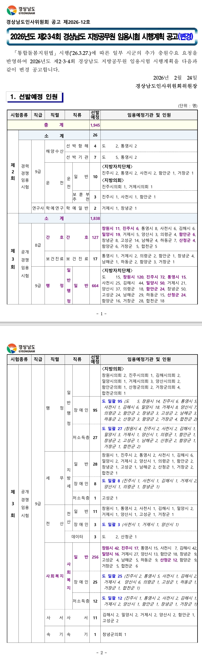 °æ»ó³²µµ ÀλçÀ§¿øÈ¸ °ø°í Á¦2026-9È£ 2026³âµµ Á¦2¡¤3¡¤4ȸ °æ»ó³²µµ Áö¹æ°ø¹«¿ø °ø°³°æÀï ¹× °æ·Â°æÀïÀÓ¿ë½ÃÇè ½ÃÇà°èȹÀ» ºÙÀÓ°ú °°ÀÌ °ø°íÇÕ´Ï´Ù. 2026³â 2¿ù 3ÀÏ °æ»ó³²µµÀλçÀ§¿øÈ¸À§¿øÀå